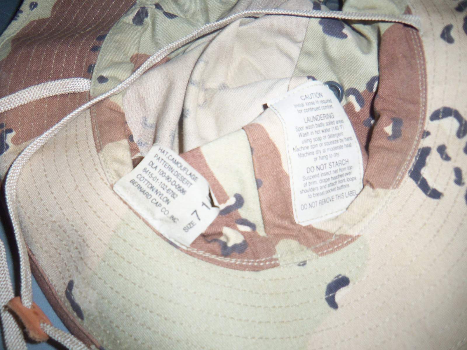 Hat, Sun, Hot Weather, Desert Camouflage Pattern Type II (Three Color). NSN 8415-01-327-4827 to 8415-01-469-2319 depending on size from 6 3/8 to 8, plus special measurement 2155-00-000-000.