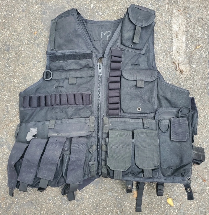По маркировкам Eagle Industries, по конструкции предполагаю что-то из линейки TAC-V на конец 90-х - начало нулевых, вероятно, полицейский вариант для разгона демонстраций (судя по подсумкам для 40мм (?) гранат и 12 калибра). Передние секции подсумков - съемные, крепятся на велкро. По словам продавца, приехал вместе с кучей полицейского снаряжения из Штатов.