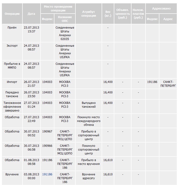 Операция Дата Место проведения операции Атрибут операции Вес (кг.) Объявл. ценность (руб.) Налож. платёж (руб.) Адресовано