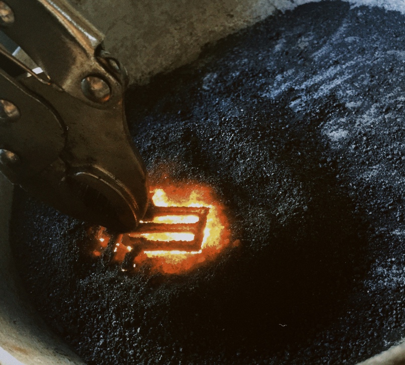 Для придания гибкости и пружинных свойств обыкновенной стали, в качестве эксперимента, было принято решение цементации. В теории это позволяло увеличить прочностные характеристики на поверхности изделия. К сварочному аппарату было закреплено изделие, масса выведена на стальную площадку с мелко-размельченным графитом (отдельная благодарность машинистам троллейбусов). При контакте с графитом, пружинный механизм подвергался насыщению углеродом: