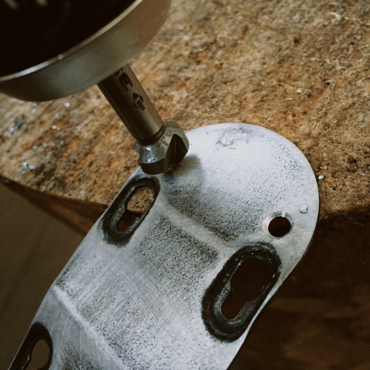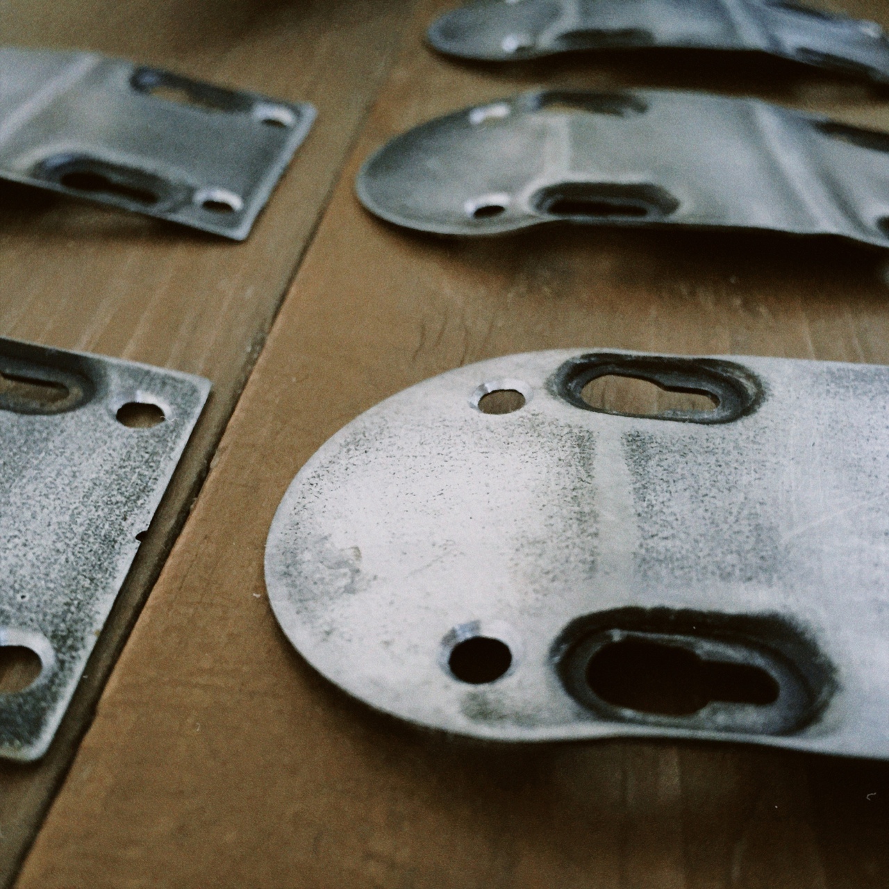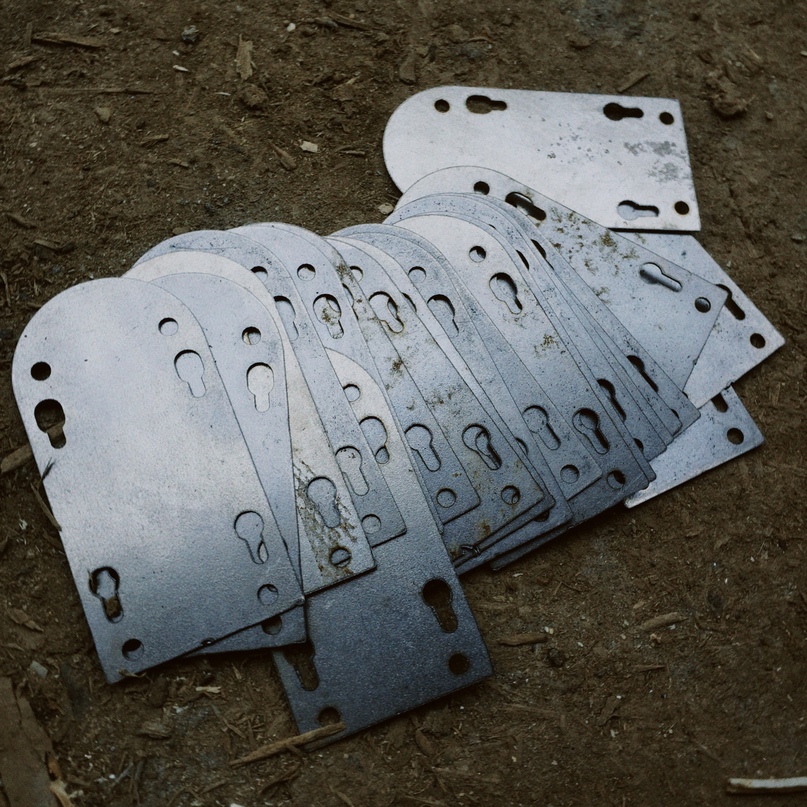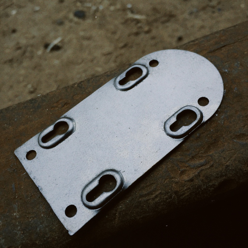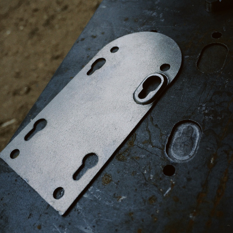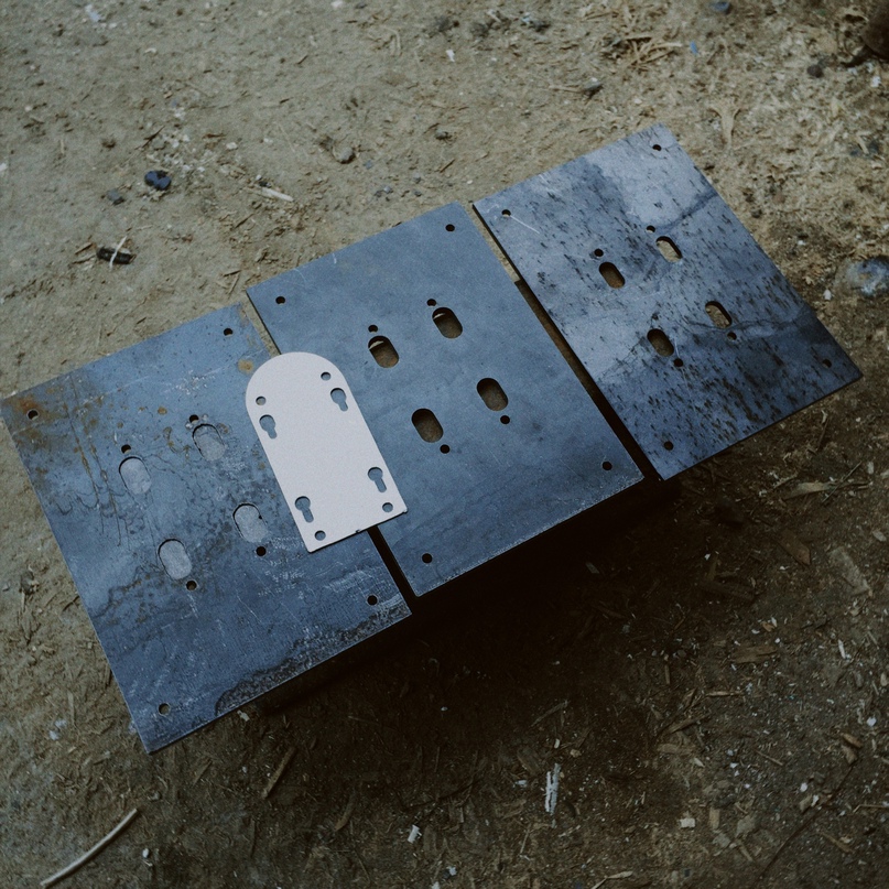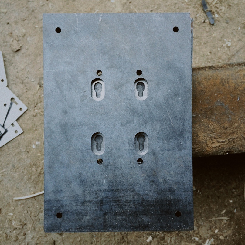 Для штамповки гнёзд передней панели мной была разработана матрица, представляющая из себя совокупность массивных пластин и пресса. Заготовка размещалась между пластинами, стягивалась болтовым соединением и фиксировалась струбцинами.