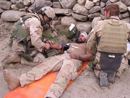 После подрыва на СВУ санитары Майк Монтойя и Бен Гиле готовят Криса Агирре к медицинской эвакуации, 11 декабря 2003 года.