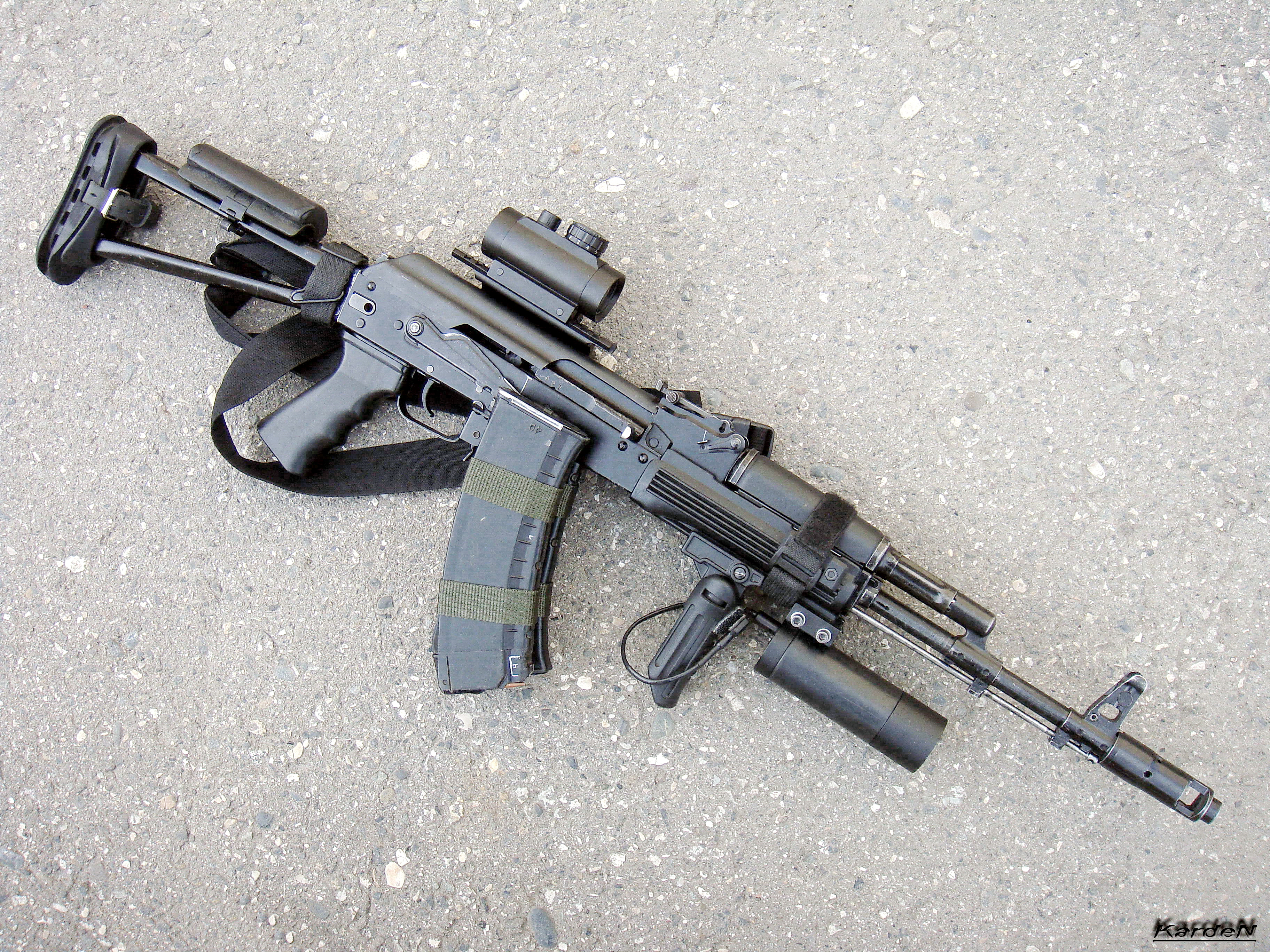 -2010 год. Приклад от АКС74У - отличается углом наклона и каналом для штифта меньшего диаметра. ССО-шный ремень и самодельные стяжки для магазинов...