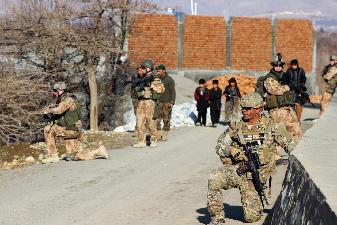 A U.S. Army soldier provides security as Czech and Afghan soldiers patrol through a village in Parwan province, Afghanistan, Jan. 26, 2015. U.S. Army photo by Sgt. 1st Class David Wheeler