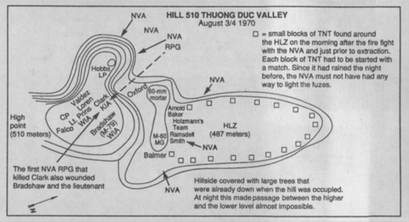 Младший капрал Секстон все еще был потрясен случившимся и тем, что он единственный выжил в засаде, не будучи убитым или раненым. Он рассказал нам о том, что произошло в начальной части засады, и как он собрал тела Хатчинсона, Сэвиджа и Канту вокруг себя для обороны, оставаясь на связи по рации и запрашивая поддержку с воздуха. Он сказал, что это было чудо, что гуки не захватили его крошечную оборонительную позицию, но двое его раненых товарищей по группе продолжали стрелять из своего оружия туда, откуда велась вражеская стрельба, и он подумал, что это, должно быть, удержало NVA от попыток захватить их. Они бросили все свои собственные ручные гранаты и забрали те, что были взяты с тел их погибших товарищей, чтобы использовать их против NVA.