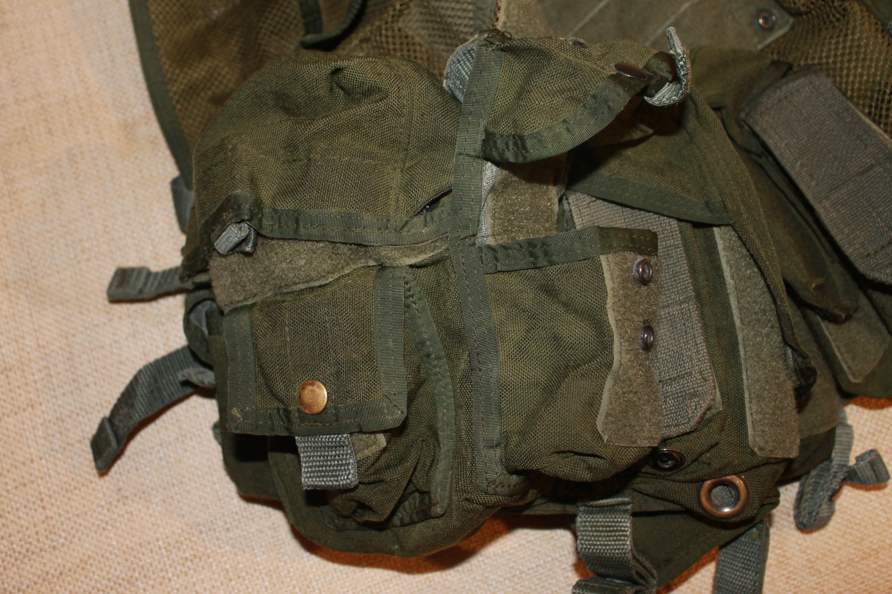 Справа и слева по два магазинных подсумка, в которые умещается по три магазина от М4, справа находится довольно объемный подсумок, предположительно для фляги одноквартовой, плюс на самом кармане еще пара карманов довольно непривычной конструкции